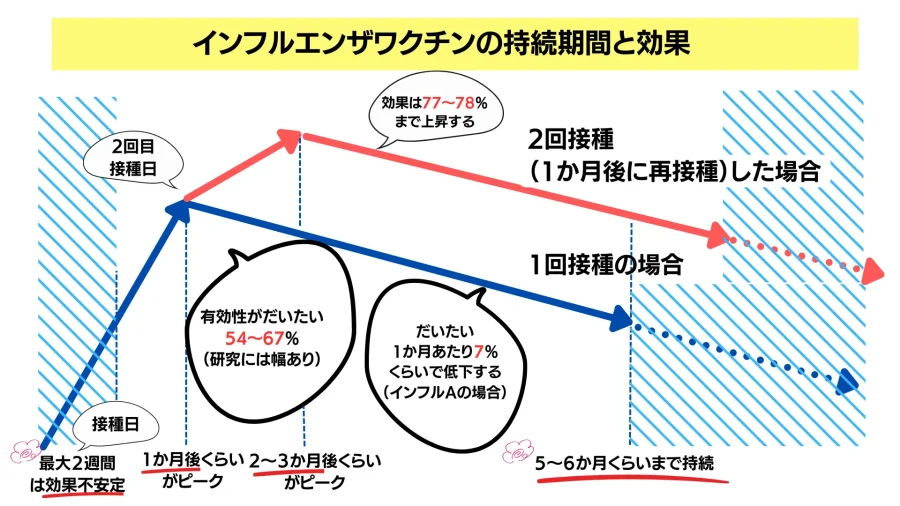 接種から2週間後から効果を発揮して、おおよそ3~5か月くらいまで効果が期待できる(´ー`*)ウンウン