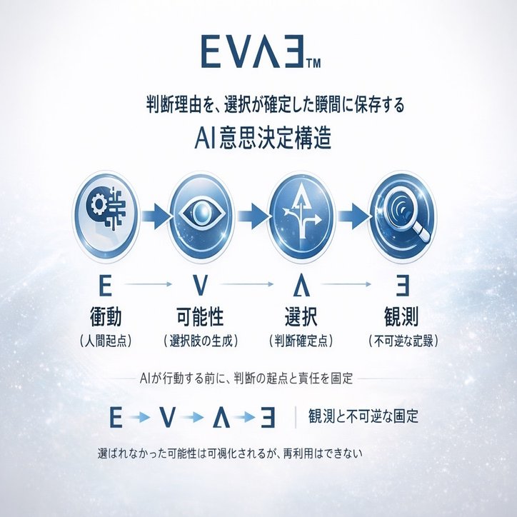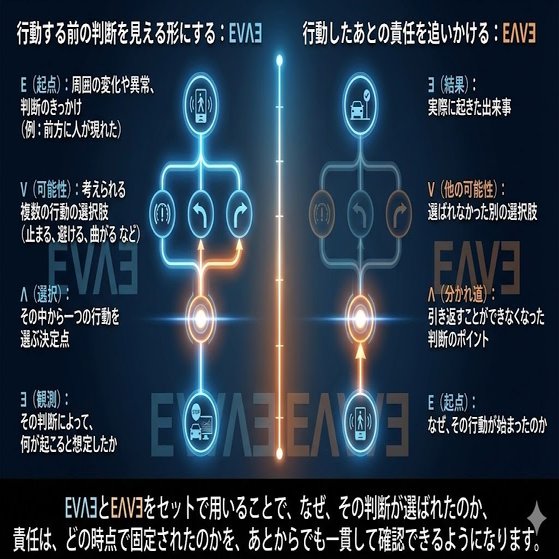 AI意思決定構造「EVΛƎ」概念図:人が責任を持つための作動・検証サイクル。