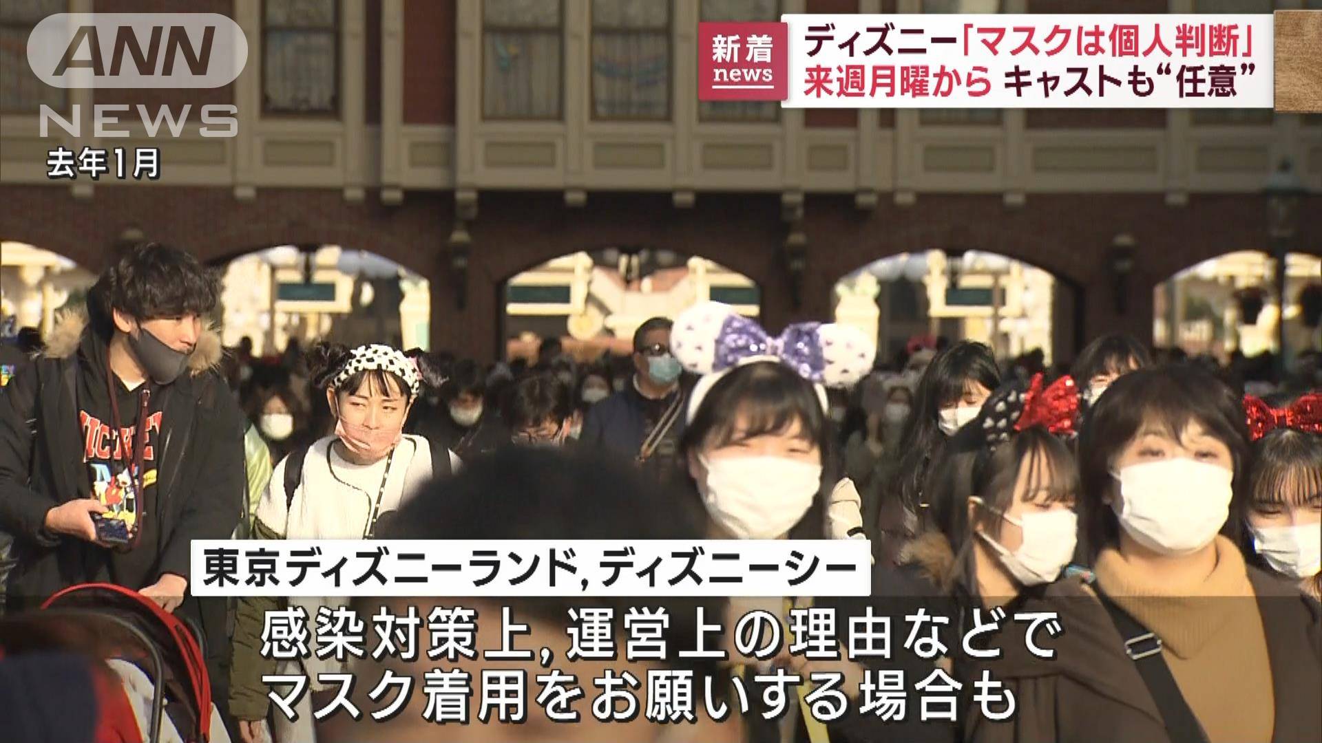 マスク解禁宣言。 東京ディズニーランドとシー、13日からマスク着用は「来場客の判断に」…従業員も個人判断【読売新聞】 東京ディズニーランドと東京ディズニーシーを運営するオリエンタルランドは9日、パーク内でのマスクの着用を13日から来場客の判断に任せると発表した。マスク着用を個人の判断に委ねるとした政府方針を受けた措置。従業員についてもwww.yomiuri.co.jp【速報】ディズニー「マスクは個人判断」 パーク内の着用...キャストも任意|FNNプライムオンライン東京ディズニーランドのマスク着用は、来園者が判断することになった。東京ディズニーリゾートを運営するオリエンタルランドは、13日からのパーク内でのマスク着用について、来園者とキャストの着用は任意とし、個人の判断に委ねると発表した。これまで、新型コロナウイルス対策として、屋外で2メートル以上の距離が確保できる場合を除いて、原則、マスクの着用が必要としていた。オ…www.fnn.jp ANN 東京ディズニー 「“マスク着用”個人の判断」ゲストもキャストも 3月13日から 東京ディズニーランドとディズニーシーはマスクの着用について13日からゲストもキャストも個人の判断に委ねると発表しました。 感染対策上、または運営上の理由などによって、マスクの着用をお願いする場合もあるとしています。 また、屋外、屋内を問わずキャラクターによる出迎え=グリーティングで一緒に撮影する際にはキャストの案内に従ってほしいと呼び掛けています…news.tv-asahi.co.jp【速報】ディズニー「マスク着用は原則、来園者個人の判断に」今月13日以降の対応を発表 | TBS NEWS DIGマスクの着用について、政府は来週月曜日から個人の判断にゆだねる方針ですが、これを受け東京ディズニーリゾートを運営するオリエンタルランドは、今後は“来園者の判断にゆだねる”と発表しました。東京ディズニ…newsdig.tbs.co.jpkakkamax※ついに来るものが来た。でもプライバシー保護のためにマスクする人は多いだろうな。トラブルは避けよう。みんなケンカしたくてディズニーに来るわけないでしょうから。