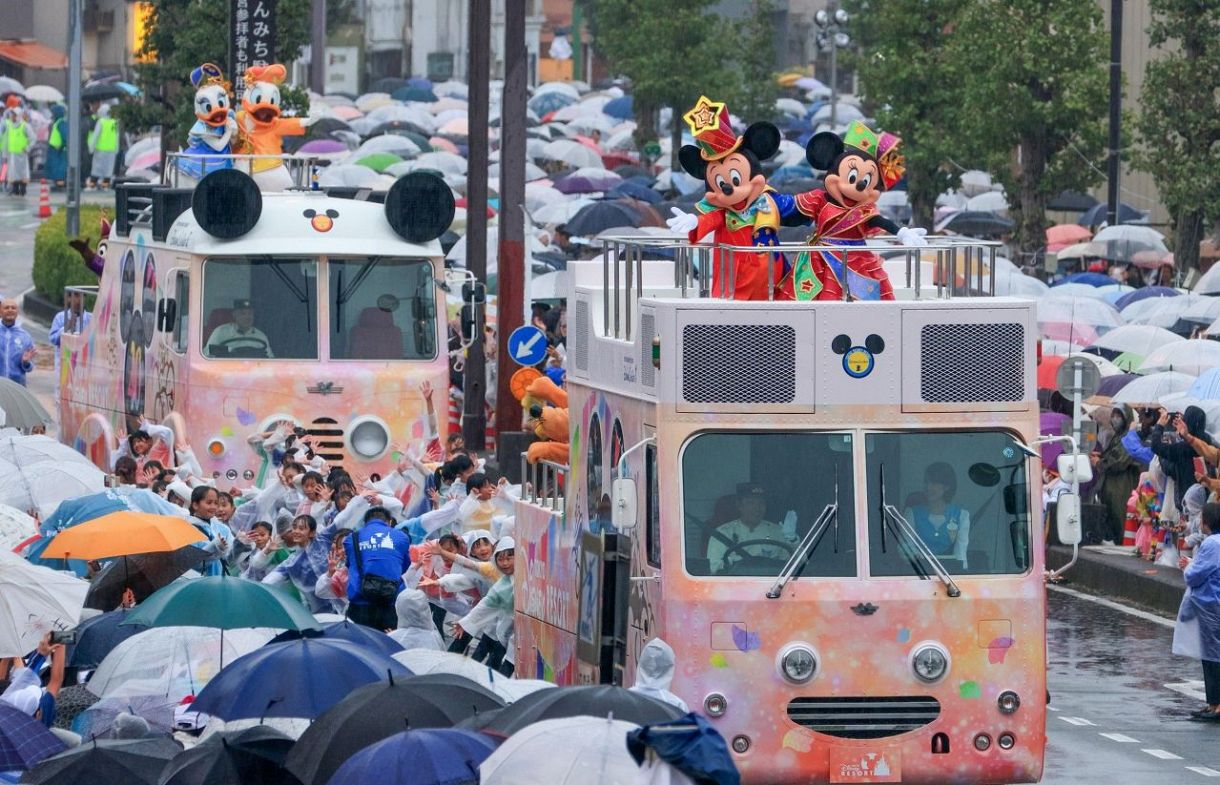 三重県伊勢市で8日行われた「#伊勢まつり」に、 #ミッキーマウス など #ディズニー の人気キャラクターが登場し、雨の中集まった観衆が #ミッキー らの #パレード に大きな歓声を送りました。中部発のニュースはこちら→https://t.co/9TyOEvUeWa pic.twitter.com/QX47tPYlwi