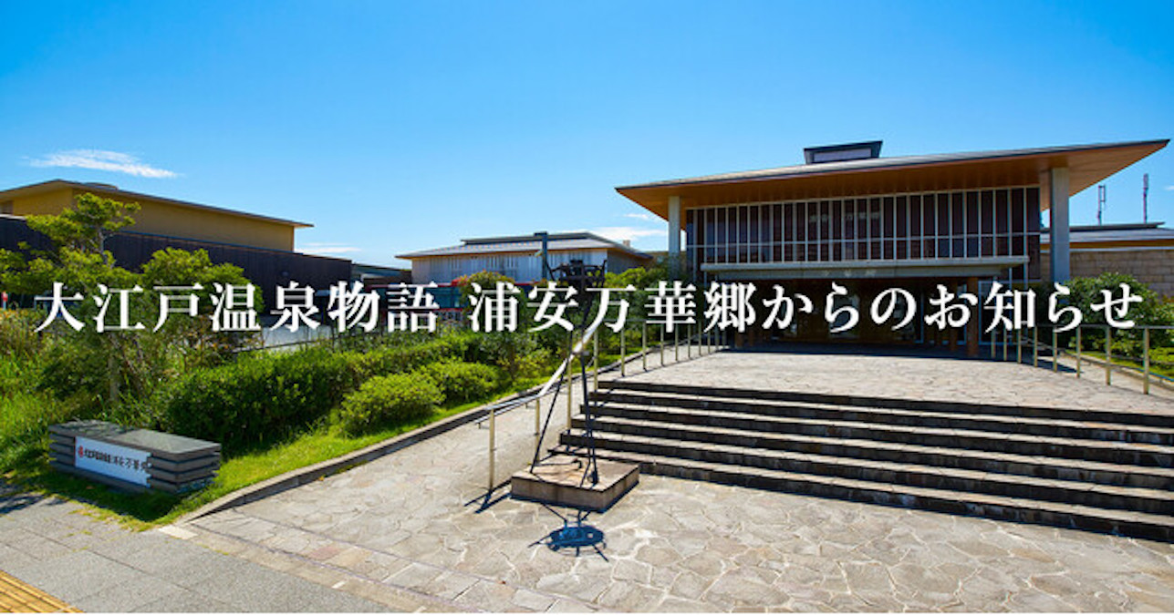 「大江戸温泉物語 浦安万華郷」閉館のお知らせ | 浦安万華郷【全38のお風呂で遊ぶ!過ごす!大江戸温泉物語No.1の圧倒的スケールの温泉テーマパーク】気軽に行ける日帰り温泉♪水着で入れる露天風呂、屋外温泉パーク「スパニワ」で湯あそび!自慢のお宿「桜花楼」でそのまま泊まれて温泉旅行も楽しめちゃう!温泉・グルメ・癒しでのんび~りリラックス♪urayasu.ooedoonsen.jp
