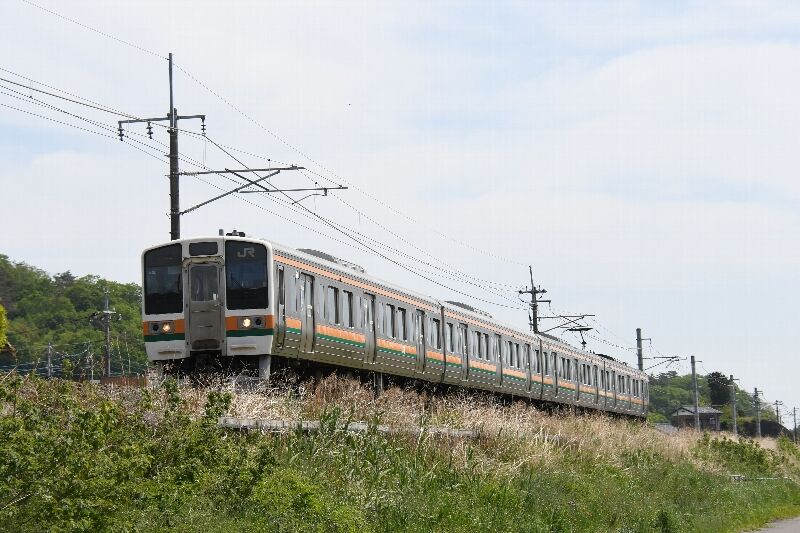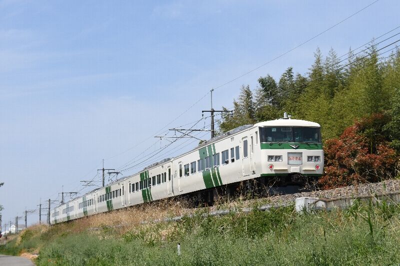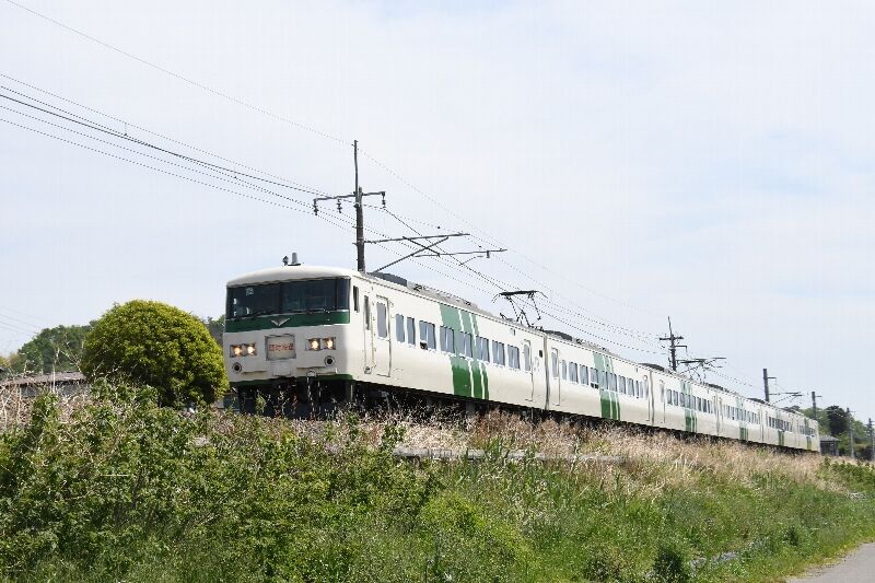 4/24 所用ついでに両毛線(185系あしかが大藤まつり号)所用ついでシリーズの続きです。金曜の所用後は 翌日に帰るだけ、それを利用してあしかがフラワーパークに 行きますと言っても、観光で並んでいる車を尻目に 誰も居ない線路際に!! あしかがフラワーパーク-足利で狙いの185系あしかが大藤まつり号1号を 撮った写真が1枚目。 後追いしたのが2枚目で、185系はB6編成で幕は臨時快速でした。 おまけは、露出合わせの211系が3枚目です。 あしかが大藤まつり号3号も185系ですが時間が空くので わたらせ渓谷鐡道のトロッコ渓谷号に転戦します。 続く!