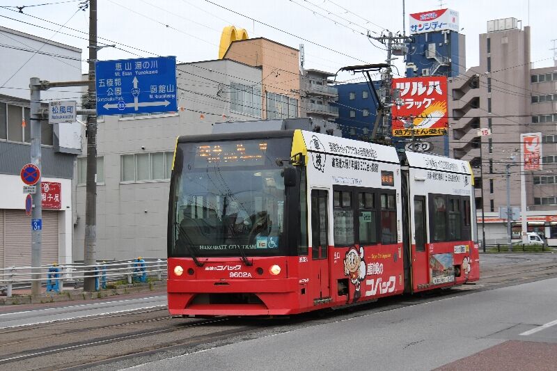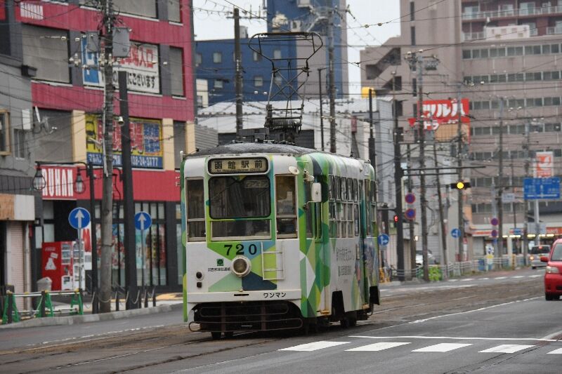 オトキュウパス遠征(函館市電)最終日に函館市電乗り鉄で函館どっく前や谷地頭に行こうと 思ったのですが、雨が降り少しだけ撮影することに! 8001号車と函館のお店が1枚目、広告は函館カールレイモン。 720号車が2枚目、広告は西武建設運輸。 函館タナベ食品広告の3004号車が3枚目。 4枚目は回転寿司の函太郎広告の3002号車。 8006号車と函館らしいお店の看板と撮ったのが5枚目の ジャックス広告車。 セイコーマートや函館の道案内と一緒に撮った9602号車 コバック広告が6枚目。 7枚目は黒い8004号車で不動産企画ウィル広告。 次は最終で、EH800とグルメをアップします。