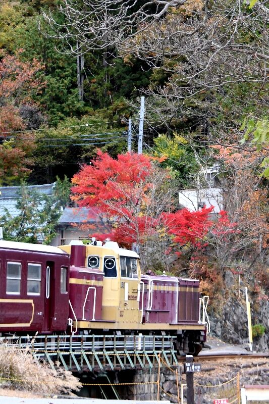 足尾銅山観光で通洞駅で下車して、出発を赤い紅葉と撮影