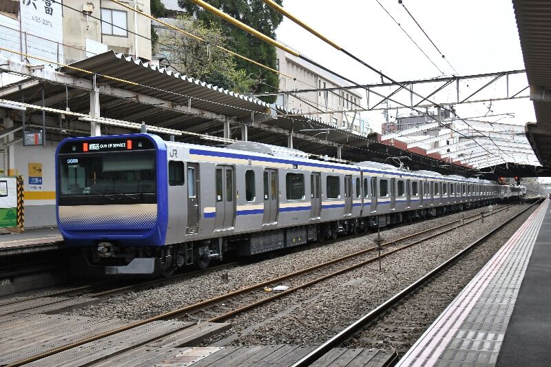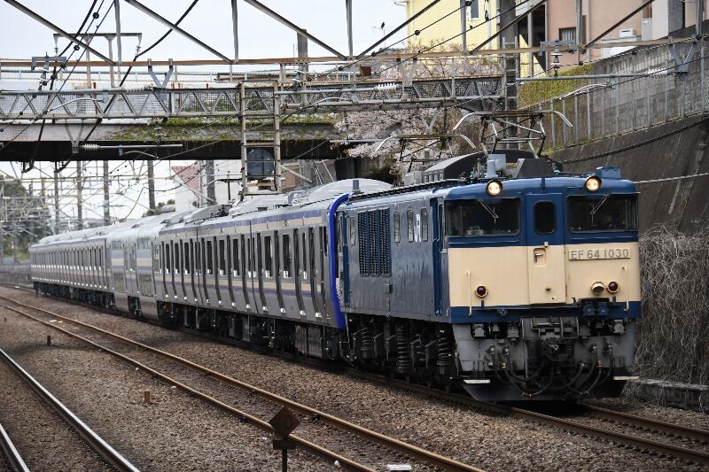 3/27 E235系1000番台 F-24編成配給昨日はE235系1000番台の配給がありました。 年度末なのか今月は配給が多いです。時間の関係もあり 新秋津で撮ったE235系1000番台F-24編成が1枚目。 釜はEF64-1030号機が牽引で、釜後ろに僅かに桜がありました。 後追いしたF-24編成が2枚目で大船に向けて走り去りました。
