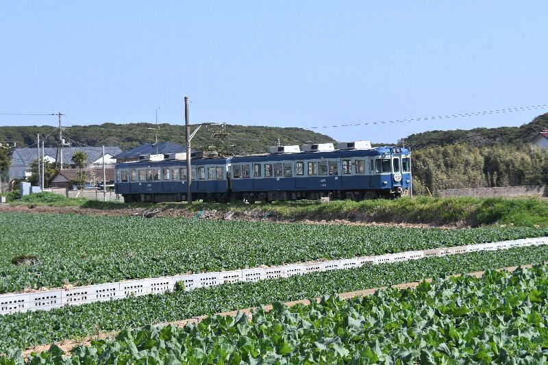 銚子電鉄の犬吠駅付近で撮ります、ちょうど春キャベツの収穫が