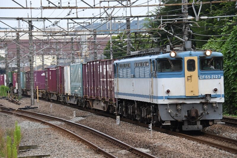 7/14 EF65-2127カラシ今日は切符購入ついでにEF65-21271本釣り! 所用前に府中本町で4073レを1本撮りして来ました。 混んでる南武線側を避けて武蔵野線側で撮った写真が1枚目。 EF65-2127カラシ+コキでした。