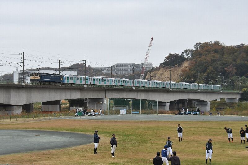 11/26 西武40000系甲種輸送本日は西武甲種輸送が地元近くを通るので、どん曇りの中 参戦しました。 多摩川鉄橋に出向き、撮影した西武40000系甲種輸送が1枚目。 新秋津に向けてのラストスパートの40164Fを少年野球のグランド を入れて撮影しました。牽引釜はEF65-2074で、今月2回目の 西武甲種輸送でした。