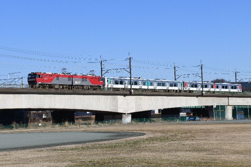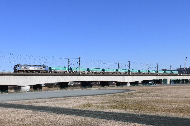 2/13 阿武隈急行AB900系 甲種輸送本日はJ-TREC横浜を出場した阿武隈急行AB900系が 福島まで甲種輸送されました。 多摩川鉄橋に出向き、阿武隈急行AB900系AB6&AB7編成の 甲種輸送を撮った遠景が1枚目で、牽引釜はEH500-39号機。 サイドに来た所を撮ったのが2枚目。 EH500-39+緑色AB7編成+赤色のAB6編成でした。 おまけは先走りの米タンで、牽引機はEF210-152+タキで ジェット燃料(JP-8)を横田基地まで運んで行きました。