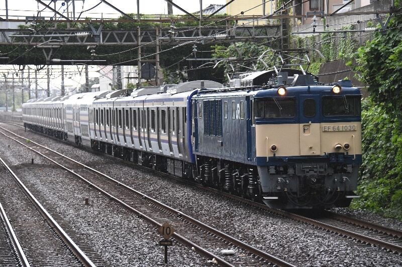 7/30 E235系1000番台 F-41編成配給本日は配給輸送があり、午後の天気は下り坂でしたので、 重い腰を上げて参戦! J-TREC新津を出発したE235系1000番台配給輸送ですが、 中央線人身事故もあり予定を変更して新秋津で撮ったのが1枚目、 通過直前に雨が落ちてきて露出がありません。 編成はEF64-1030+E235系1000番台11B。 大船に向かうF-41編成を後追いしたのが2枚目、すでに基本編成 41本と終わりが近づいて来ました。 おまけは先走りで来た、単機のEH500-5号機の露出合わせが3枚目。