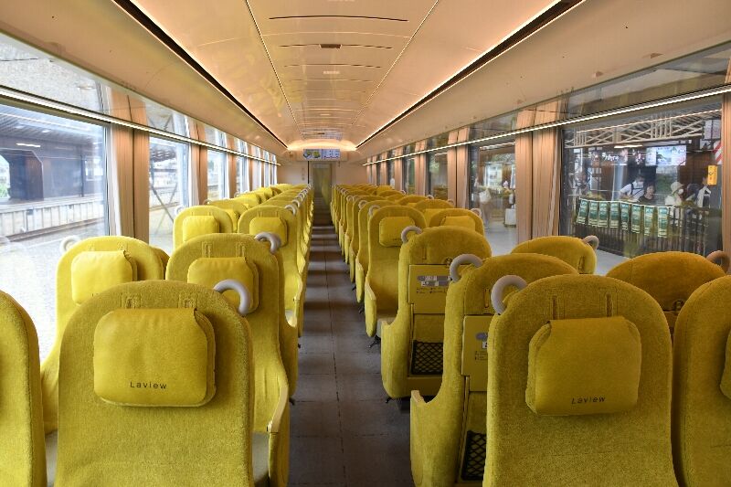 所沢から初めて乗った大きな窓が特徴の001系ラビューの車内が1枚目。