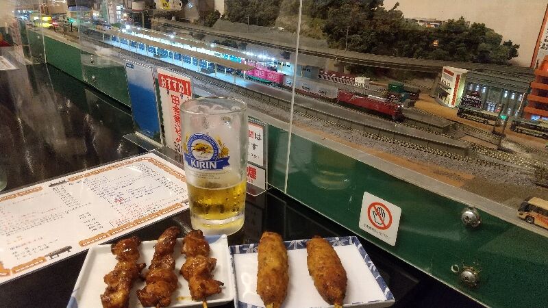美味しいくるみ味噌タレやきとりとビールなどとジオラマを