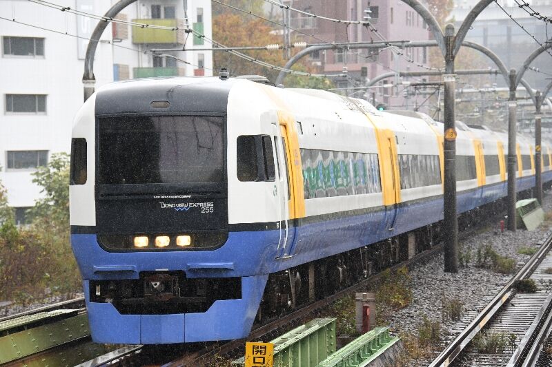天気も悪く間に合う千駄ヶ谷で撮影したのが1枚目の255系Be-03