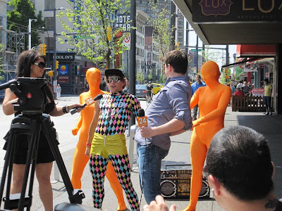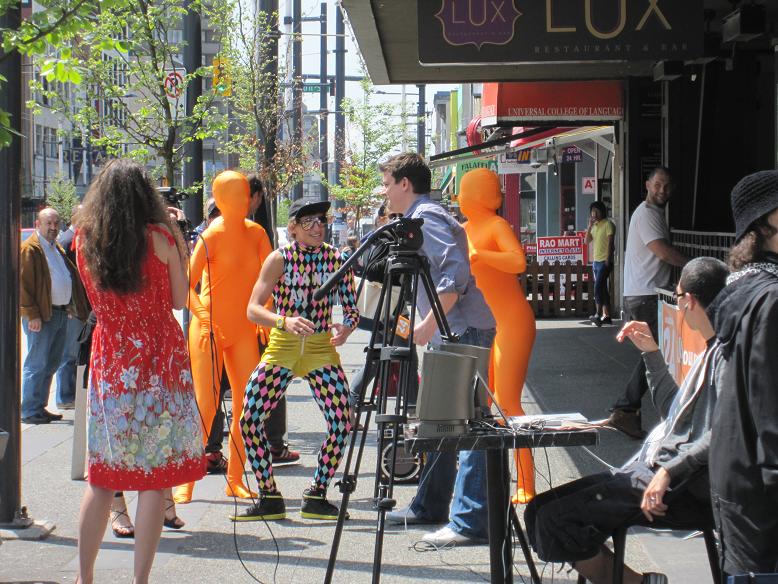 色っぽい人たち・ 街角でオレンジな人たちを発見しました。 テレビカメラの前でクネクネ。 ・ マイクを持った司会らしき人も一緒にクネクネ。 ・ ノリノリクネクネ。 ・ 最近のカナックスのゲームによく出没していた緑の人たちの仲間の人たちでしょうか。 今年は全身タイツが流行のようです。 ・ 指の運動にボタンをポンっ! カナダ留学・ワーホリ情報
