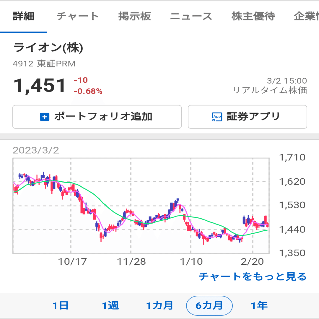 ライオン 株主優待 2023.3.2仕事から帰ったら、ライオンから株主優待届いてました〜! 今年は赤いぞ! さっそく中身を開封! じゃじゃ~ん 6点も入ってました!!! ~箱の中身~ 1点目 クリニカ PRO [医薬部外品] オールインワン ハミガキ フレッシュクリーンミント 歯磨き粉 フッ素 歯周病 95g+フロス付き Amazon(アマゾン) 713円 Amazon(アマゾン)で詳細を見る 楽天市場で詳細を見る 2点目 システマ ハグキプラス プレミアム [医薬部外品] デンタルリンス エレガント フルーティミント(ノンアルコール) 600ml+Y字フロス Amazon(アマゾン) 700円 Amazon(アマゾン)で詳細を見る 楽天市場で詳細を見る 3点目 キレイキレイ 薬用手指の消毒ジェルプラス ノンアルコール手指消毒剤 40ml(約80回分)×2個パック[新指定医薬部] Amazon(アマゾン) 925円 Amazon(アマゾン)で詳細を見る 楽天市場で詳細を見る 4点目 トップスーパーNANOX 本体 400g × 3個セット Amazon(アマゾン) 1,172〜2,680円 Amazon(アマゾン)で詳細を見る 楽天市場で詳細を見る 5点目 トイレ掃除 トイレ泡ピタ トイレ洗浄スプレー クールシトラスの香り 本体 Amazon(アマゾン) 323〜1,380円 Amazon(アマゾン)で詳細を見る 楽天市場で詳細を見る 6点目 【Amazon.co.jp 限定】【まとめ買い】 チャーミーマジカ 食器用洗剤 酵素プラス フルーティオレンジの香り 本体220ml+詰め替え 大型 880ml Amazon(アマゾン) 594円 Amazon(アマゾン)で詳細を見る 楽天市場で詳細を見る 洗剤とか歯磨き粉とか妻が喜びそうです♪ 気になるライオンの現在の株価は… 2023.3.2時点 @1451円です。 私は@1600円ぐらいの時に買ってしまっているので赤字です… ですが、毎年届く優待が中々豪華なので気に入っています!!