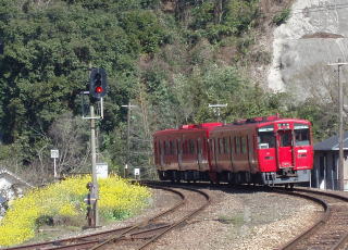 菜の花の横を走るコトコト列車ものどかです。(久大線といえば、黄色い1両列車のイメージがありますが、