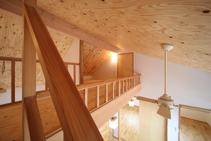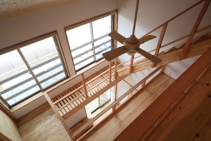 ↑吹抜上部のシーリングファンは、ロフト2から、掃除やメンテナンスができる位置に取り付けています。