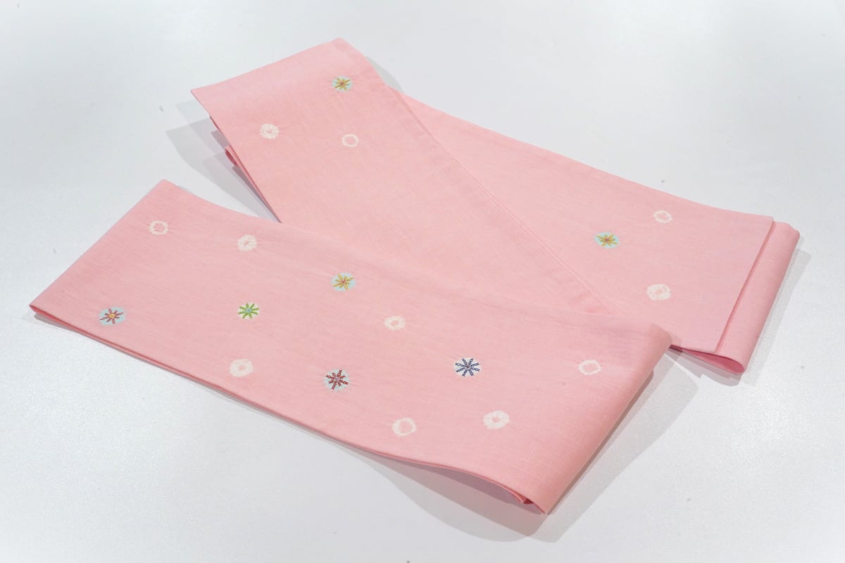 半巾帯「絞り刺子綿麻・丸に幾何柄」キャンディーや水風船、ビー玉を思わせる様なカラフルで楽しい雰囲気に仕上げられた一本。 地色のピンク色も落ち着いた染め上がりとなっており、大人可愛さを演出してくれる夏の一本となる事でしょう。 丸紋を絞りで表現し、その中には刺子でひとつずつ手仕事を重ねて柄付けを施しました。 柄付けは前腹部分と両手先に施されています。 木綿や紬に合わせて、気軽にお楽しみ下さい…kimono-minoko.stores.jp