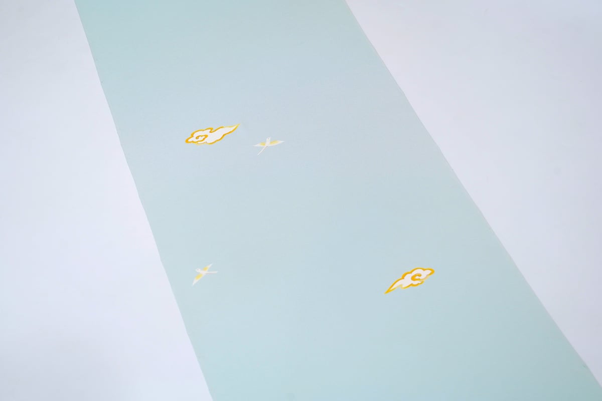 水色の地色にに瑞雲と鳥が染め上げられた、