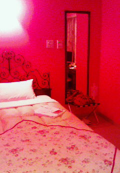 部屋はレディースルームで、壁紙は赤、ベッドカバーは花柄という・・・ちょっとどぎついよ。微妙に落ち着かないから(笑)