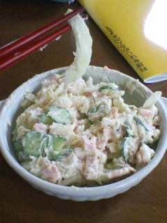 まずポテトサラダ。結果的には、タマネギが細かく切れずに極太だったせいで、かなり辛いポテトサラダに・・・。