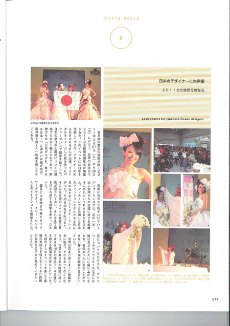 05/11: 台湾花博出演時の取材記事掲載本日二つ目のブログアップです。先ほどの大阪教室ブログもお見逃しなく! お花屋さんが読む植物デザインという本に台湾花博に出演した時の模様が取材されたのが掲載されました。私が台湾の方からの義援金100億円超に対して日本を代表して日の丸に御礼感謝の言葉を書いて記者会見した様子やショーの模様が掲載されています。