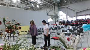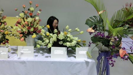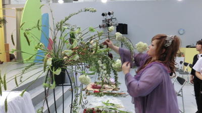 ショー会場で買ってきた花を並べてアレンジメントを作りだす私。
