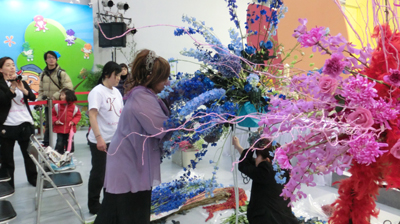 全国から参加のみなさんの作品展はこんな感じで作品の前に名前と都市名を表示。花博観覧の世界からの人達が参加の皆さんの作品も観覧するとともにカメラを向けていました。