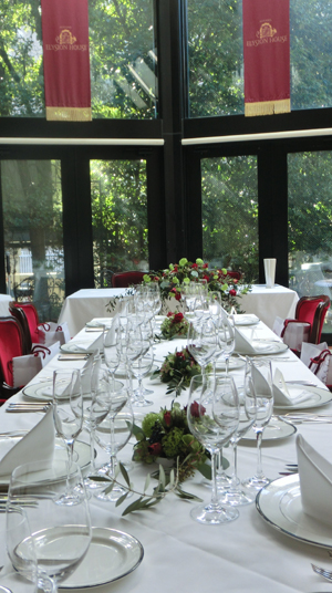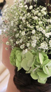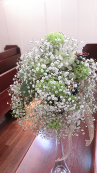 こちらはパーティー会場のフラワーデザインのリクエストであるおしゃれなグリンをふんだんに・・・ナチュラルっぽくと言う、その感じをかすみ草にマッチさせます。