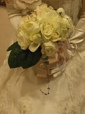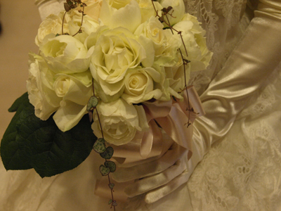 さりげなく束ねたクラッチブーケをさりげなくもつお嬢様。オフホワイトや純白の花たちにハートかずらをまとわせて。。かわいい。。。。