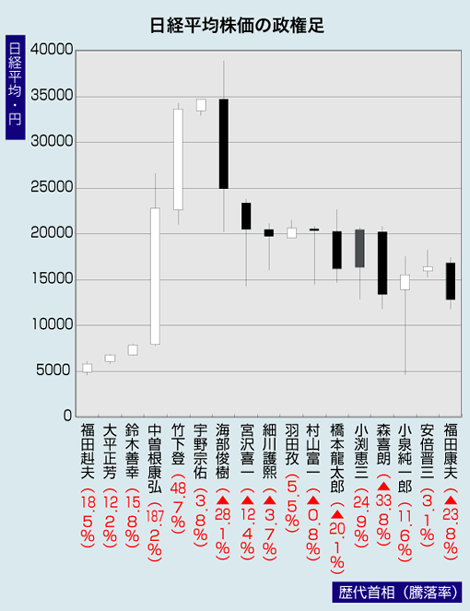 小泉政権では長い下ヒゲを引いた後、5首相ぶりに陽線になった。