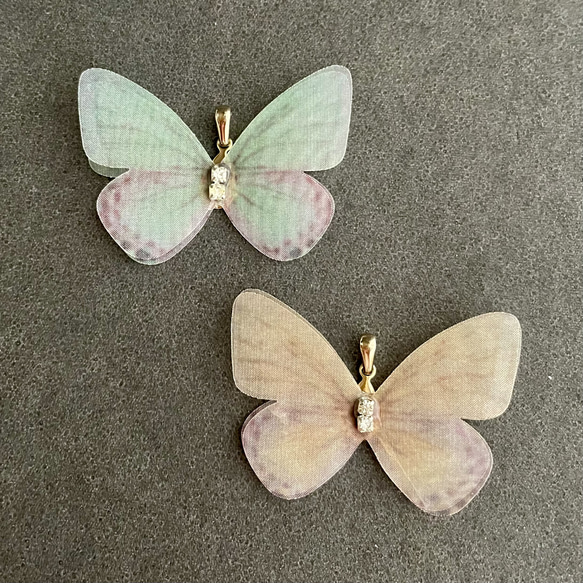 写真に写っている大きな蝶モチーフは、ポニーフックに使用しているものと同じで、少しの風でゆらゆらと羽が動く繊細なつくりをしています。