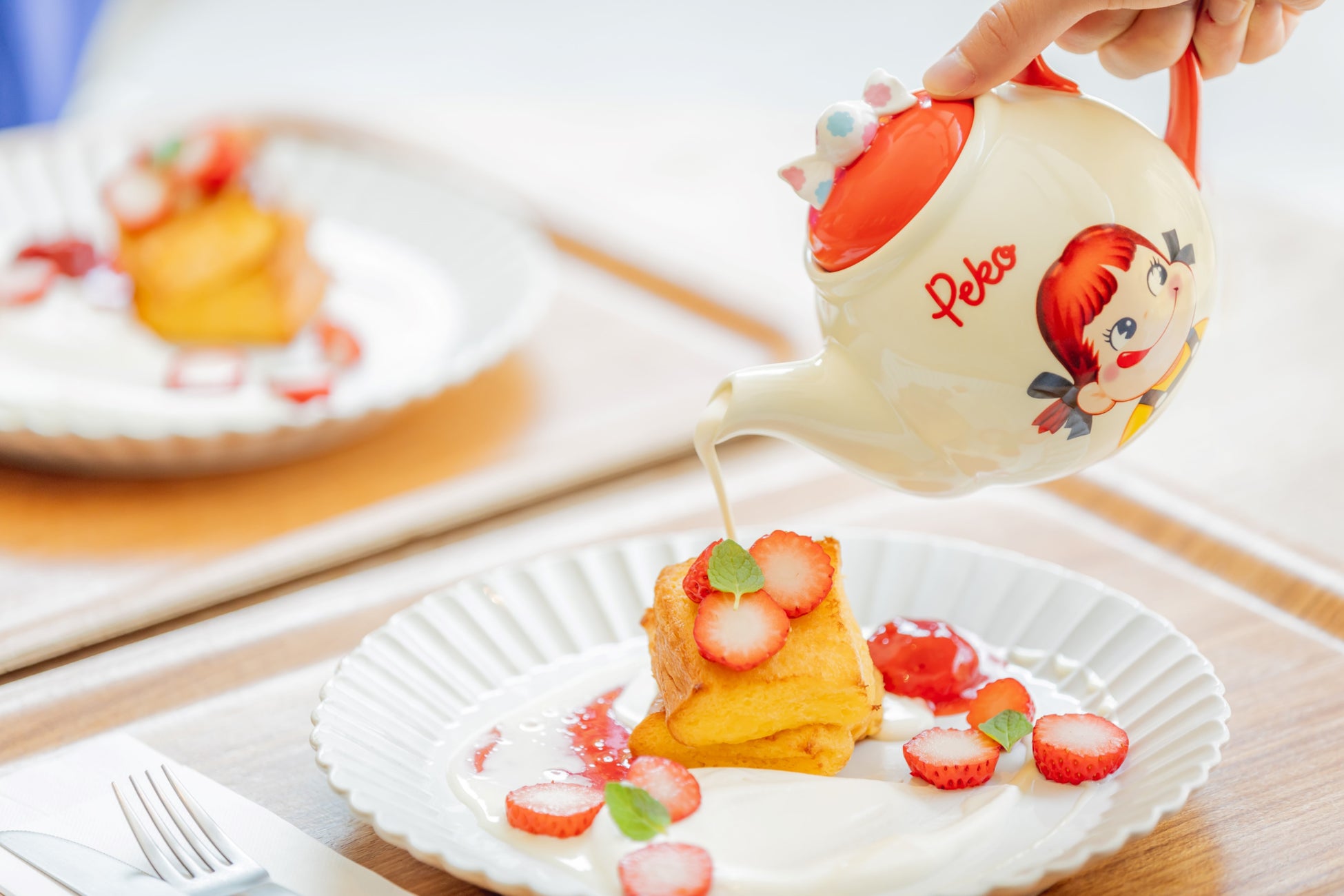 BEB5軽井沢のオリジナルフレンチトーストにいちごをトッピングした朝食を用意。可愛いペコちゃんポットに入ったミルキーソースをたっぷりかけて、ミルキー味の朝食を思う存分楽しむことができます。