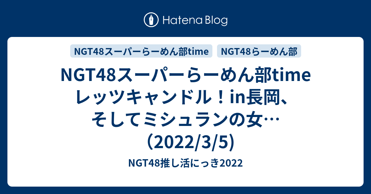 NGT48スーパーらーめん部time レッツキャンドル!in長岡、そしてミシュランの女…(2022/3/5) - NGT48推し活にっき2022#嗚呼!NGT48らーめん部 #58 TVer ↓ tver.jp Youtube ↓ (7分間のその後も収録!) www.youtube.com www.youtube.com ななみん、ゆーちゃん、ゆなこで長岡へ。 前回の合い言葉は、渋めの声で「HADO」。 今回は、艶っぽく「レッツ、キャンドル」。 長岡駅に近い「Hand made candle TAi…ngt-tokimusume.hatenablog.com