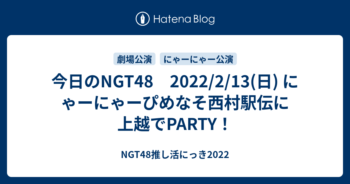 今日のNGT48 2022/2/13 にゃーにゃーぴめなそ西村駅伝に上越でPARTY! 今日のNGT48 2022/2/13(日) にゃーにゃーぴめなそ西村駅伝に上越でPARTY! - NGT48推し活にっき2022劇場公演 にゃーにゃー公演 & ぴめなそ公演 西村駅伝 BIG SMILE PARTY お酒とエンタメで楽しもう 舞台「サザエさん」明治座公演 千穐楽 劇場公演 にゃーにゃー公演 & ぴめなそ公演 昼公演 12:00開演 夜公演 17:00開演 出演:日下部愛菜・清司麗菜/中井りか・安藤千伽奈 www.dmm.com 西村駅伝 2区 開演 17:00~ 3区…ngt-tokimusume.hatenablog.com