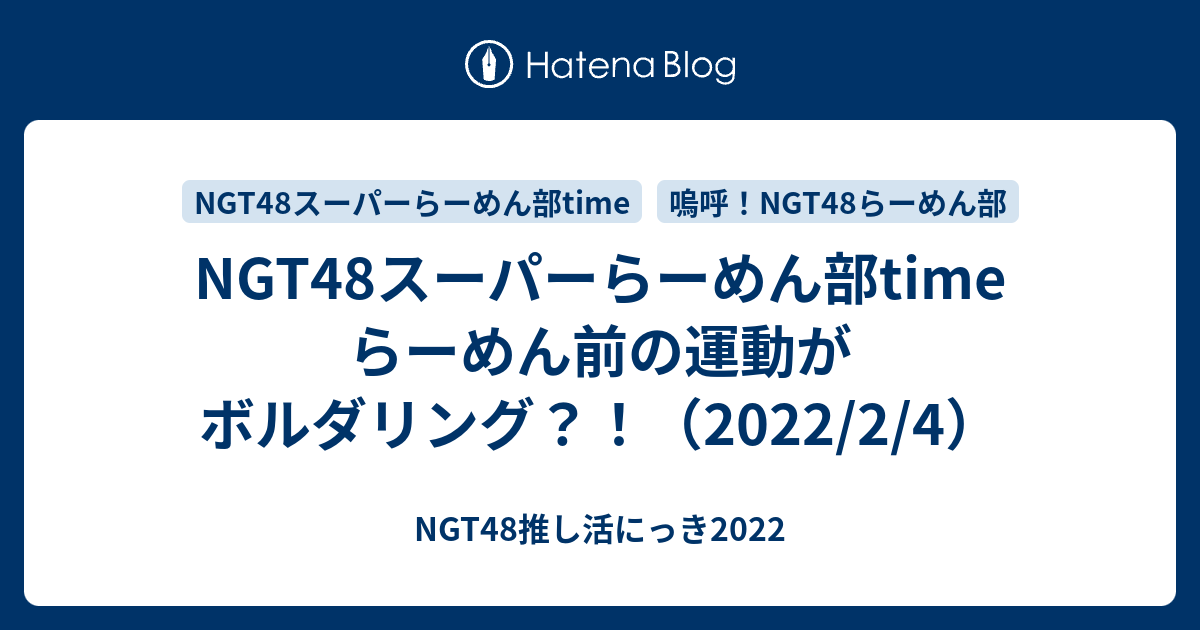 NGT48スーパーらーめん部time らーめん前の運動がボルダリング?!(2022/2/4) - NGT48推し活にっき2022嗚呼!NGT48らーめん部 #54 嗚呼!NGT48らーめん部 #54 TVer ↓ tver.jp Youtube ↓ (5日(土)10:00更新) www.youtube.com 今週からゲストにのえぴー! 卒業直前スペシャルが始まります。 そして、あゆたろう、れいにゃー、のえぴーという、「がたフレ」だったら間違いなく神回になったであろう、うるさい(褒め…ngt-tokimusume.hatenablog.com