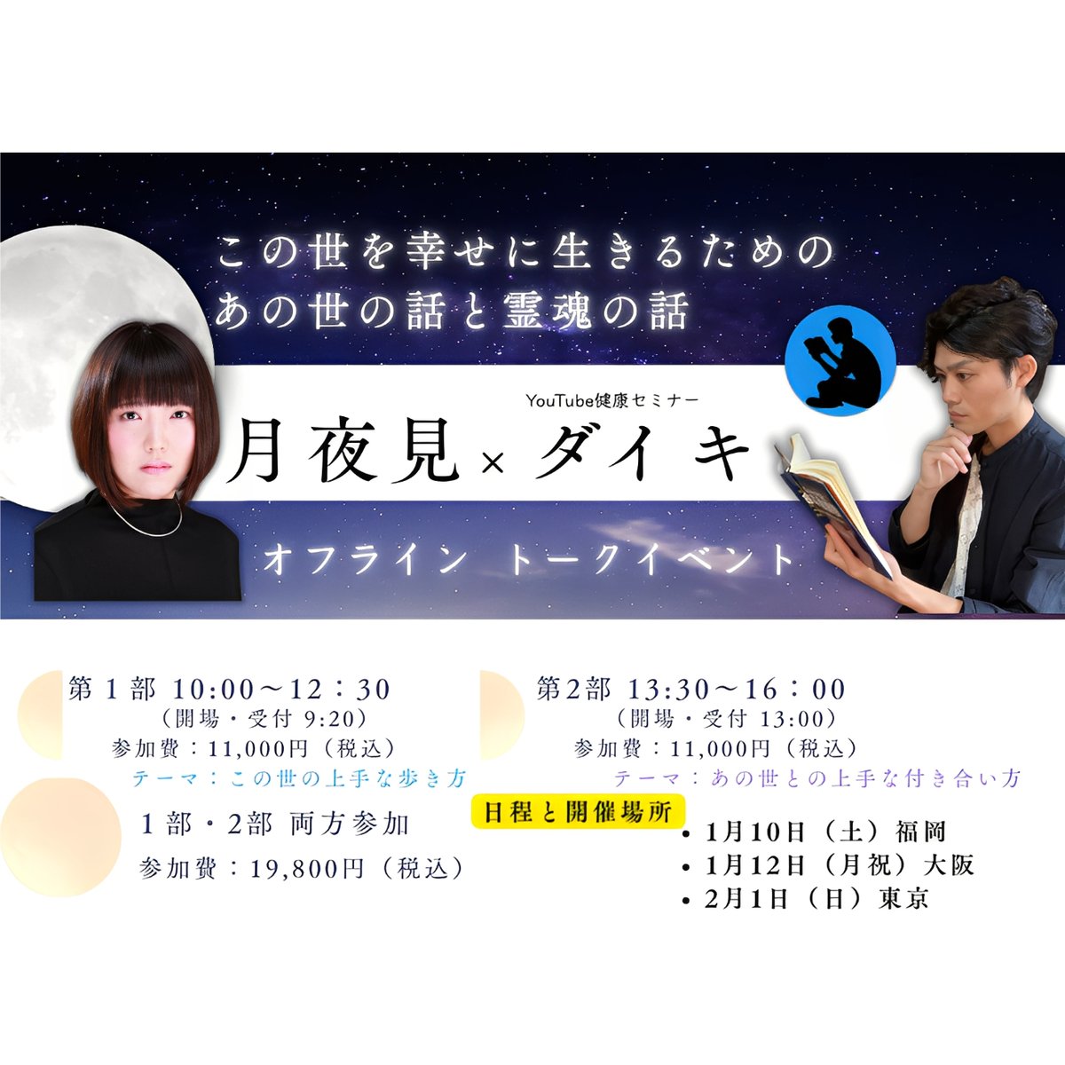 月夜見×ダイキ トークイベント 申し込みフォーム霊能者 月夜見先生のトークイベントになります。司会進行、ファシリテーターを「YouTube健康セミナー」主催のダイキが行います。①ご参加希望の会場(アーカイブ配信もございます)②参加区分(1部 or 2部 or 両方)以上の2つを選択し、お申し込みください。【日程と会場】※各会場の詳細は、お申し込み後に送られるメールにてご案内させてい…daiki358.stores.jp