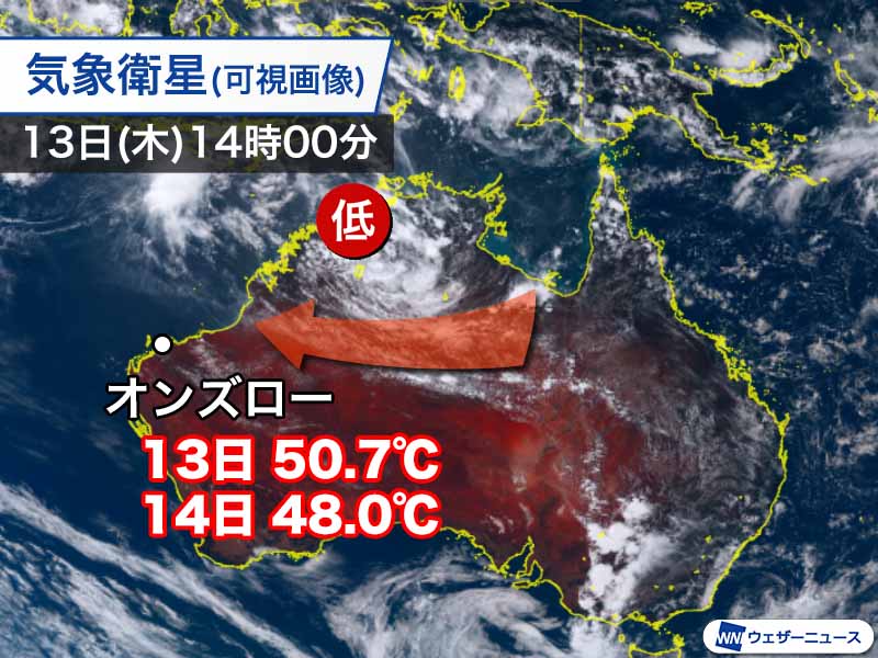 真夏を迎えているオーストラリアでは13日(木)から西部を中心に熱波に見舞われました。西部の沿岸に位置するオンズロー空港では13日(木)の気温が前日よりも12℃以上高い50.7℃まで上昇。2011年12月22日に記録した49.2℃を上回り、観測史上1位の記録を更新しています。