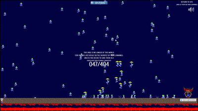 最後のレミングスがゴールに入っていくと、画面には「○○(救ったレミングスの数)のレミングスを助けてくれてありがとう。でも今後虐殺を避けたいならこのページには来ない方がいいね;)」というテキストが表示されます。
