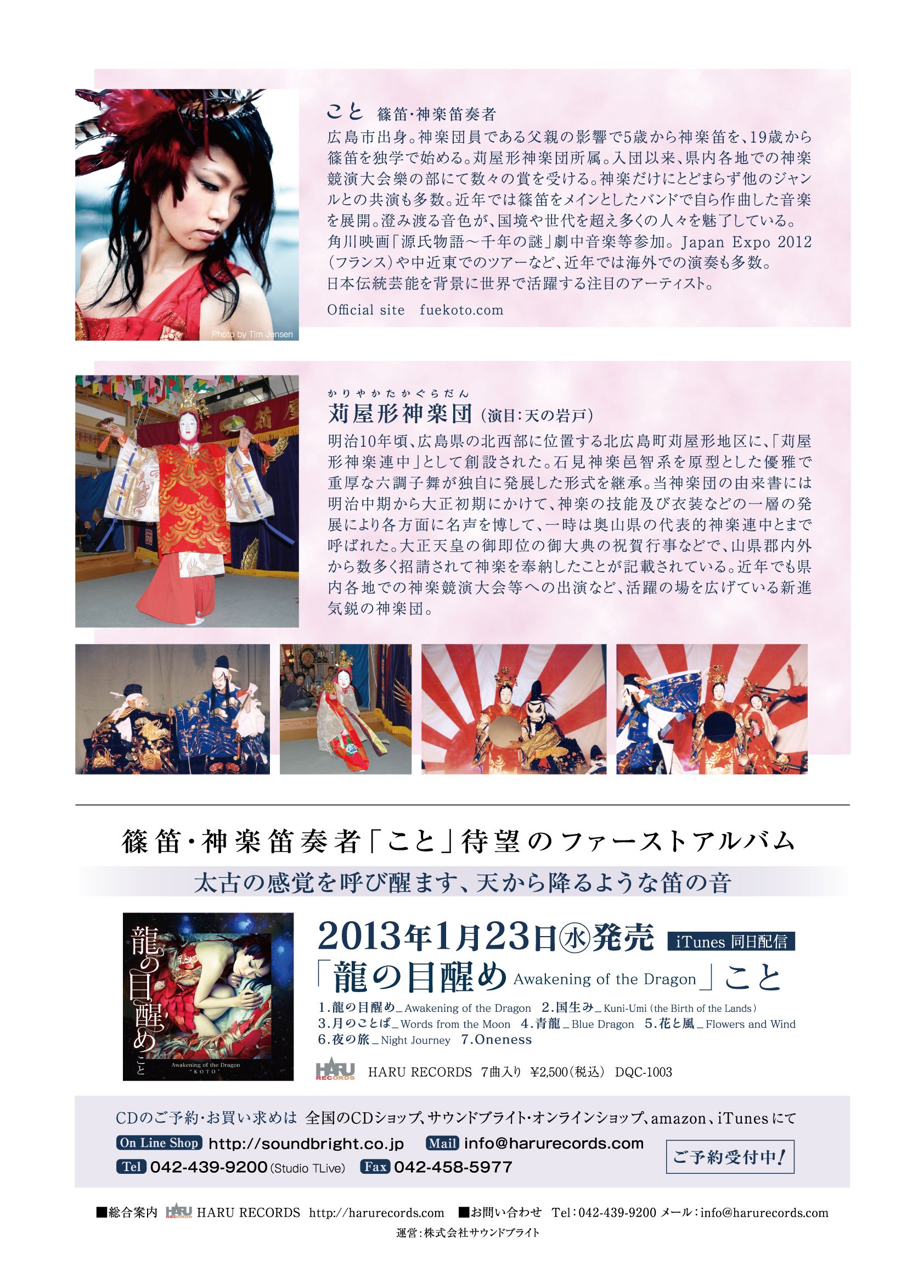 なんだかこの作品を聴き、ああやって間近に生の篠笛の音色を聴くと、ことさんの本業、神楽の演奏もじっくりと聴いてみたくなります。