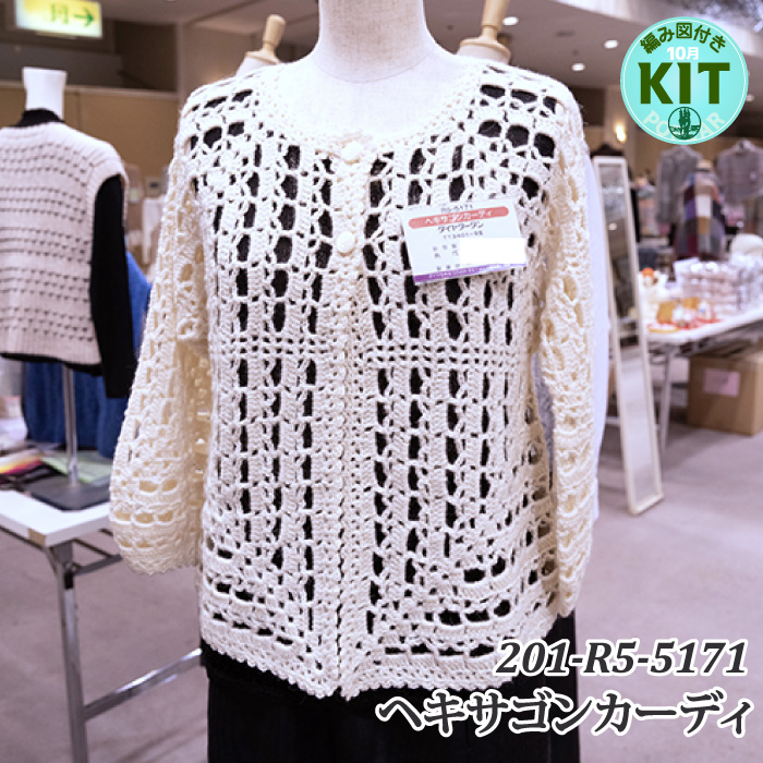 六角形(ヘキサゴン)のモチーフを2枚編んで作るカーディガンのことをヘキサゴンカーディガンというんです。