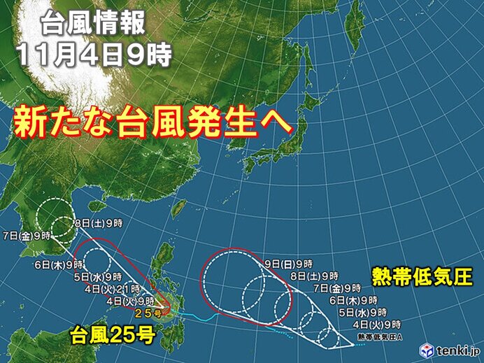 新たな台風発生へ カロリン諸島の熱帯低気圧が発達予想 今後の動向に注意(tenki.jp) - Yahoo!ニュース台風25号に加えて、新たな台風が発生する予想です。気象庁はカロリン諸島の熱帯低気圧が、今後、台風に発達する見込みと発表しています。今後の動向に注意が必要です。news.yahoo.co.jp