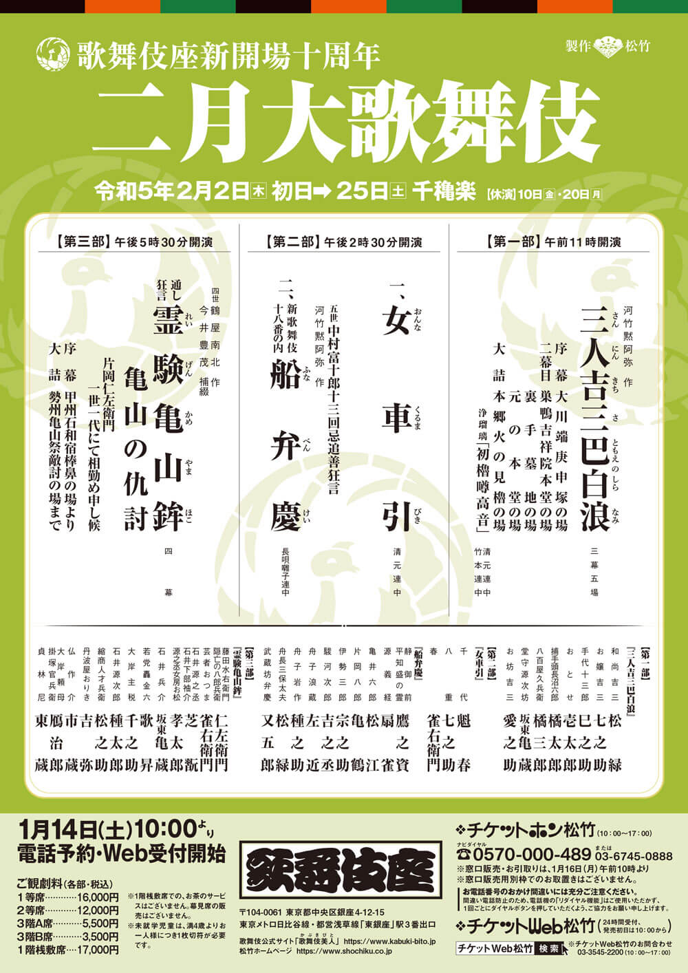 ;第一部『三人吉三巴白浪』、第二部『女車引』『船弁慶』、第三部通し狂言『霊験亀山鉾 亀山の仇討ち』