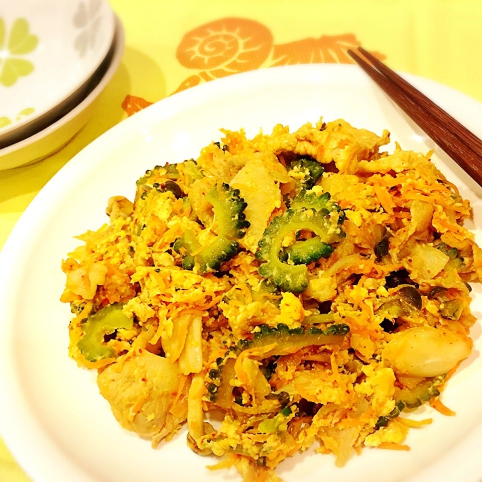 02輪切り半分を千切りしたゴーヤ※、スライサーでスライスした人参、しめじを加えて全体を炒め合わせる。