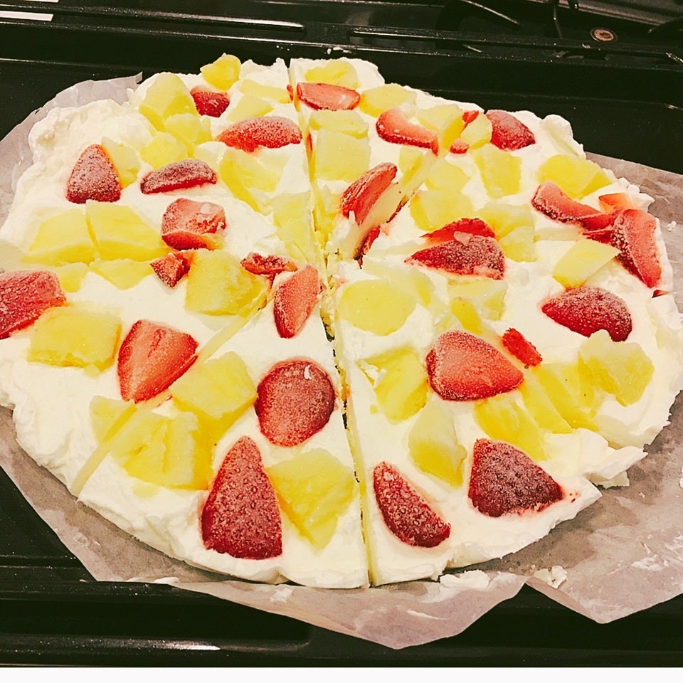 021をケーキ焼き型などの容器に流し入れて上にパイナップルとイチゴを埋め込むように散らばせる。