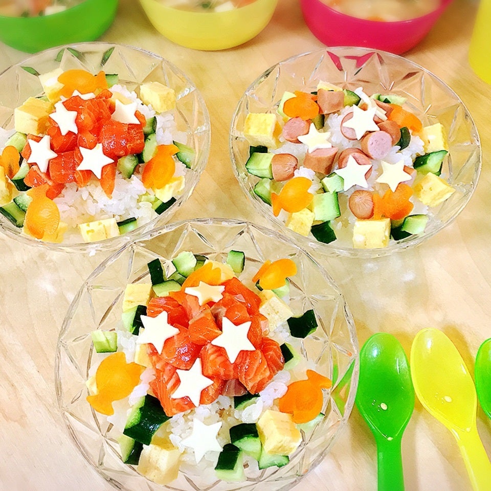 冷蔵庫で冷やしたサーモンに、まぐろ丼のタレを混ぜて5分漬け込む。酢めしを器に盛る。☆の順に具材をのせて☆お星さま☆を飾って完成!