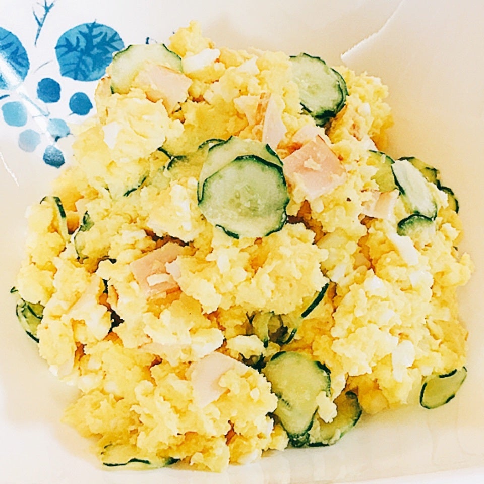 021にフォークで細かく潰した茹で卵、約1センチ角に切ったハムを加える。☆調味料を上から順に加えて馴染ませ、最後スライサーでスライスした胡瓜を加えてサックリと混ぜ合わせて完成!