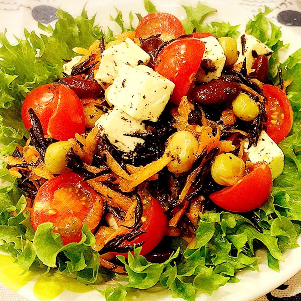 食物繊維たっぷりのひじきとお豆が入った栄養満点サラダ。副菜を手早くもう一品!というときに時短で簡単に作れて、しかも低カロリー、健康ダイエットにもおすすめの一品です!