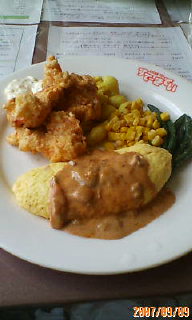 kimiが選んだのは、オムレツ(クリームソース)とからあげ、パン、コーヒーのセット。