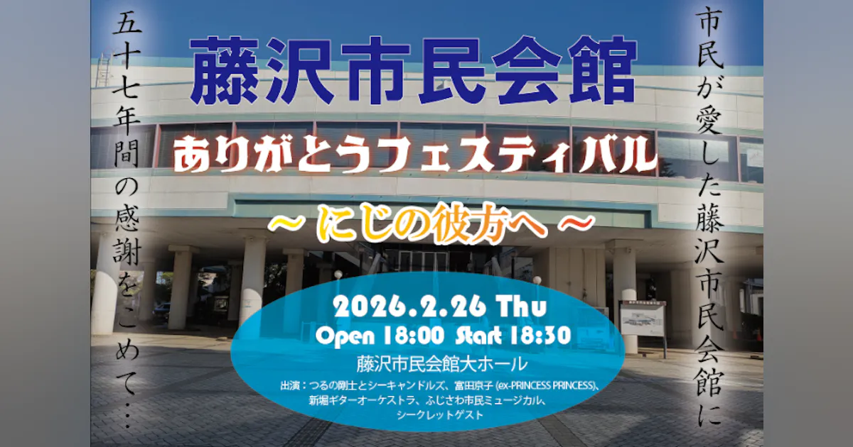 藤沢市民会館は、1960年代の開館以来、60年近くにわたり市民の文化・芸術・音楽活動を支えてきました。2026年3月に建て替えの為一旦閉館を迎えるにあたり、その歴史に感謝を捧げるともに、新しい市民会館の誕生を未来への希望として祝う記念イベントを開催いたします。
